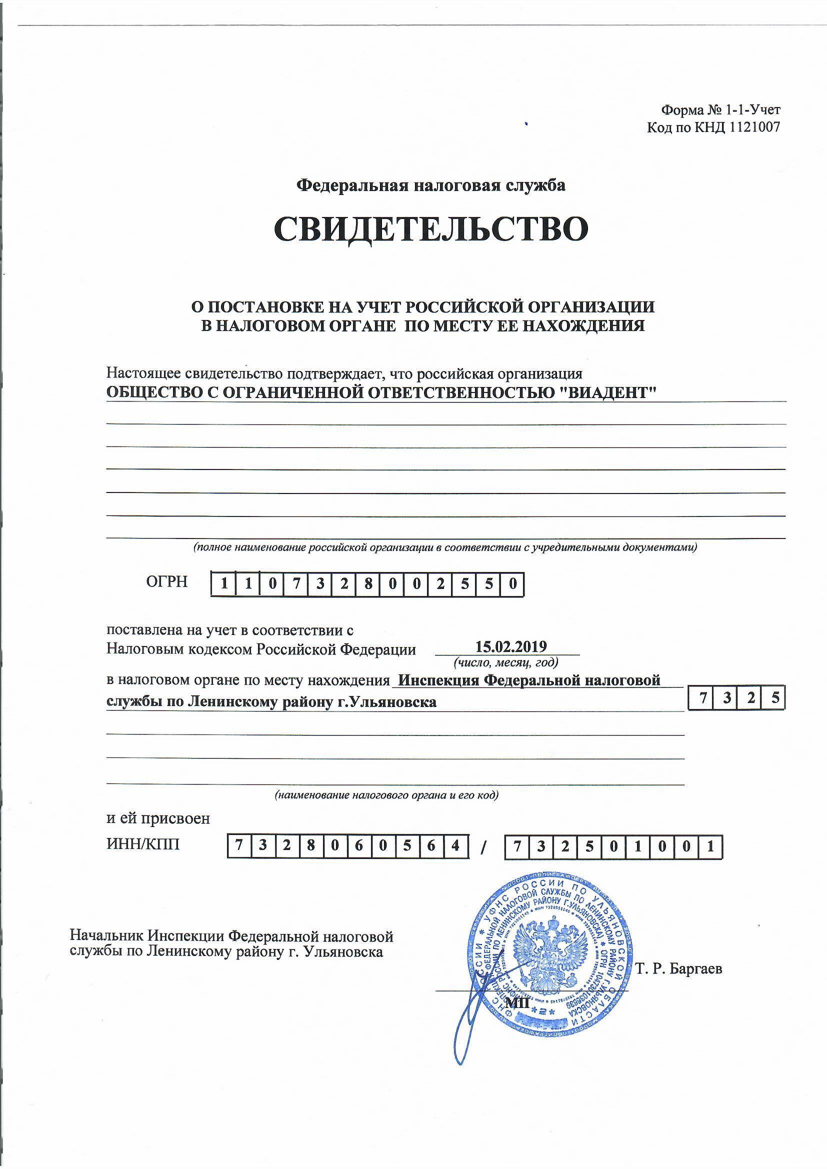 Свидетельство о постановке на учет в налоговом органе